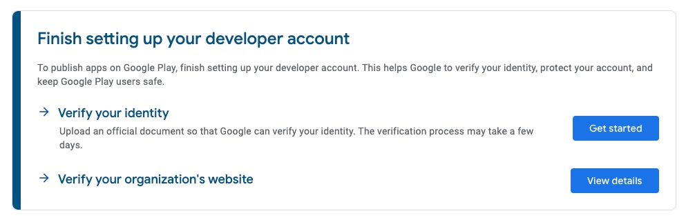 In order to publish the app, you will need to enroll in Google’s Play Store if you haven’t done so already. You can do so by visiting the Play Store Console. Make sure to complete the signup once you've created your Developer account. This process may take several days and must be complete before we can publish any apps.