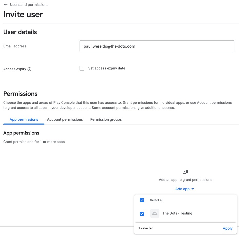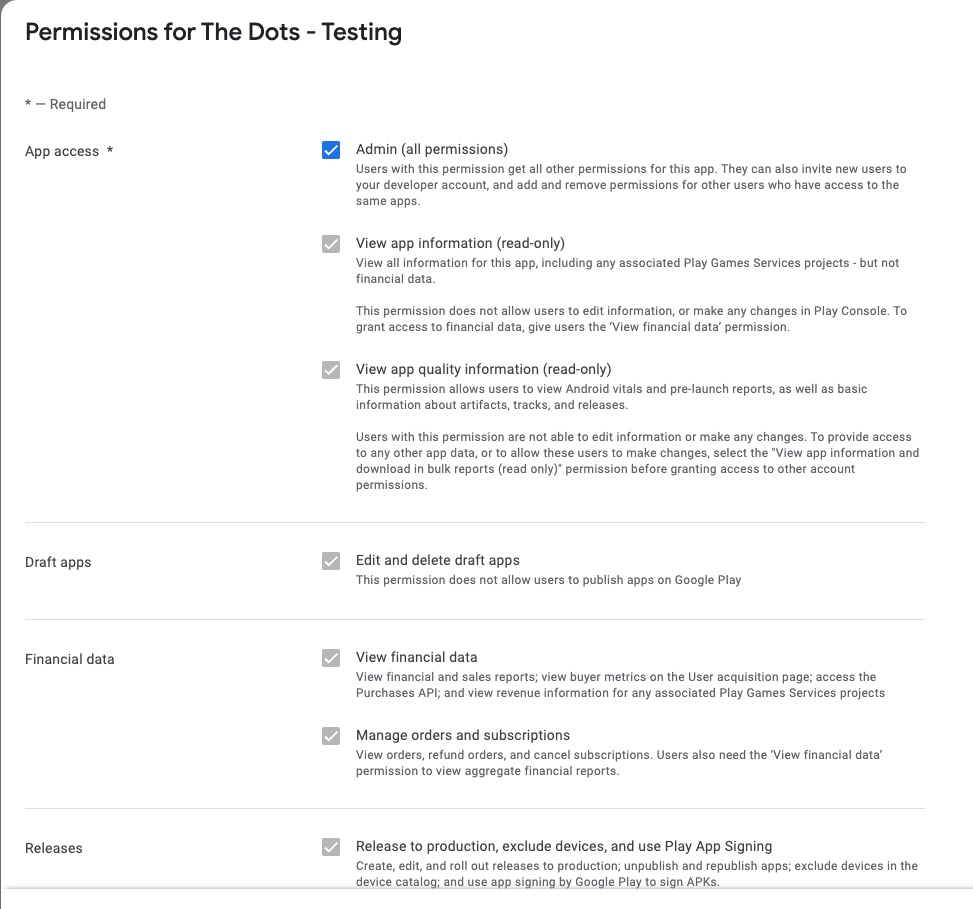 Make sure to select only the app you just created and then click "apply". You will then be prompted to grant the invited user permissions: we recommend "admin" as the only permission that is not necessary for us to operate your app are the ones under Financial Data.