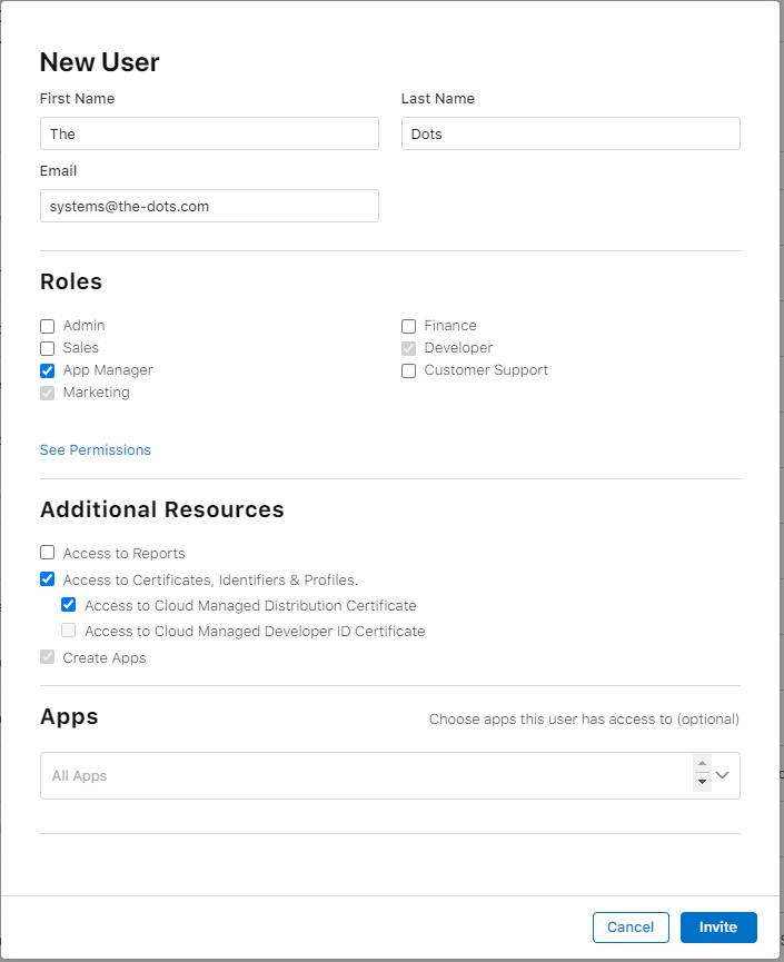 We require the Developer role permissions at a bare minimum, and we do recommend granting App Manager permissions so that we can release critical versions of the app when necessary. This may include, but is not limited to, hotfixes for P1 bugs, or cases where we have to time releasing the app to coincide with updates to our infrastructure and backends. Additionally, you will have to grant us access to Certificates, Identifiers & Profiles and Cloud Managed Distribution Certificate. These are required in order for us to submit builds.