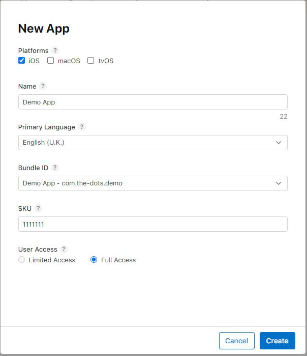 Once you’ve created your bundle identifier, you can head to App Store Connect (link) and create a new app. None of these details are relevant to us, except the User Access. If you select limited for that option, you will have to explicitly grant us (and any other App Store Connect user) access to the app. Make sure you select iOS as platform and the Bundle Identifier created in the previous step.